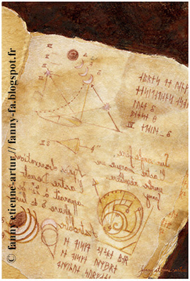 Grimoire fantasy, runes et astronomie. Acrylique et crayons.